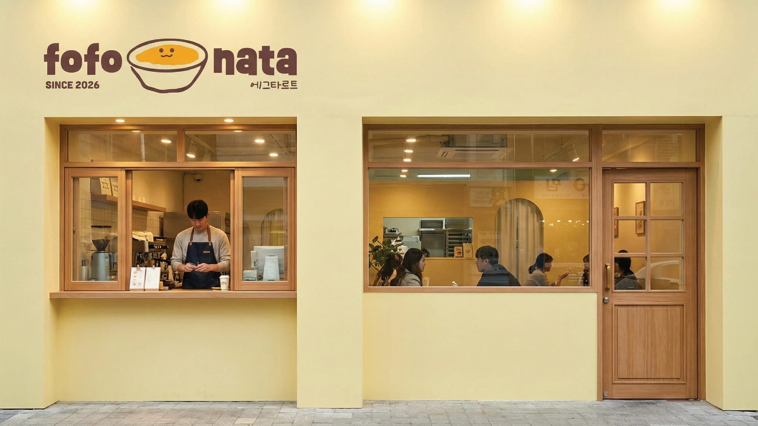 fofo nata is a character-based logo design inspired by the cute nuance of its name and the sweetness of egg tarts. Using rough pencil illustrations, the design emphasizes a soft, approachable, and warm aesthetic. The yellow and brown color scheme reinforces the brand's identity, while diverse product applications illustrate its high scalability for commercial use.